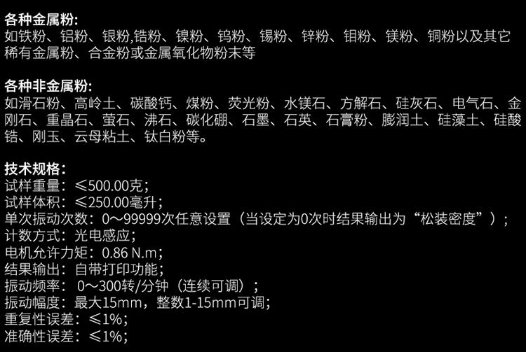 振實密度測試儀由計數(shù)系統(tǒng)、控制系統(tǒng)、驅動機構、執(zhí)行機構、微型打印機以及附屬備件等組成,具有操作簡便、經久耐用、測試準確等特點,適用于非金屬粉、金屬粉體、制藥、化工、電池、