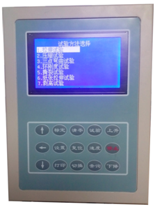 最后兩行是操作提示,其中第一行反白顯示,表示默認(rèn)的是第一行,按[↑]、[↓]鍵可在多個(gè)選項(xiàng)里變換,這些選項(xiàng)都是前一步選擇所需要的參數(shù),前一步的選擇不同,本屏選項(xiàng)的內(nèi)容和數(shù)目也不同。用[↑]、[↓]鍵選中某個(gè)選項(xiàng),則該選項(xiàng)反白顯示,這時(shí)按[設(shè)置]鍵,則該選項(xiàng)內(nèi)容的最后一位閃爍顯示,表示該位可以修改,按[↑]、[↓]鍵則該位在0-9之間變化,按[←]鍵則前移一位閃爍顯示,該項(xiàng)的內(nèi)容修改完畢后按[設(shè)置]鍵,則數(shù)字停止閃爍,整個(gè)參數(shù)項(xiàng)繼續(xù)反白顯示,這時(shí)按[↑]、[↓]可以選擇其他參數(shù)項(xiàng)。當(dāng)所有的參數(shù)修改完畢后按[復(fù)位]鍵,則保存剛才所有的修改并進(jìn)入到正常試驗(yàn)狀態(tài)
